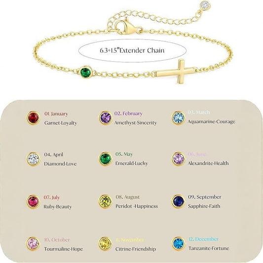 18K Gold-Plated Cross Bracelet with Birthstone, Women's Birthday Gift